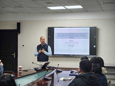 12月4日,珞珈經(jīng)管青年論壇第四百九十五期——管理科學(xué)與工程論壇在學(xué)院419舉行,香港科技大學(xué)商學(xué)院盧立建助理教授應(yīng)邀作題為“When Ethics Meet Algorithms: Corporate Social Responsibility in Personalized Pricing and Network Effects(當(dāng)?shù)赖聹?zhǔn)則與算法相遇:個(gè)性化定價(jià)與網(wǎng)絡(luò)效應(yīng)中的企業(yè)社會(huì)責(zé)任)”的學(xué)術(shù)報(bào)告。本次論壇聚焦“數(shù)字市場(chǎng)中的企業(yè)社會(huì)責(zé)任與個(gè)性化定價(jià)”領(lǐng)域,學(xué)院許明輝、戴賓等多位老師及學(xué)生參加,管理科學(xué)與工程系陳植元老師主持。