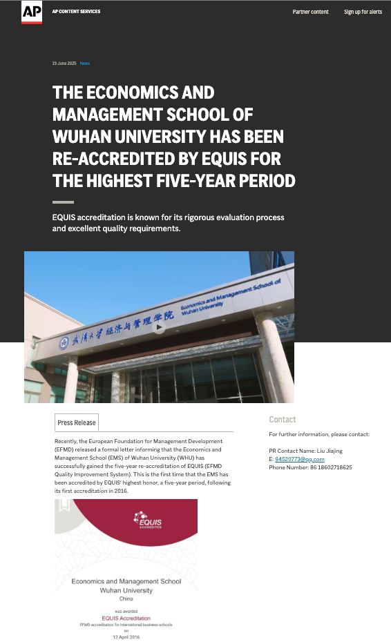 近期,學(xué)院成功通過了EQUIS五年期再認(rèn)證。這一消息以新聞標(biāo)題“The Economics and Management School of Wuhan University has been Re-accredited by EQUIS for the Highest Five-year Period”發(fā)布后,迅速被美聯(lián)社等國際主流媒體廣泛傳播。隨后,包括美國雅虎財經(jīng)、加拿大環(huán)球郵報、英國金融時報、新浪香港在內(nèi)的739家權(quán)威媒體也紛紛轉(zhuǎn)載了這一新聞,引起了全球范圍內(nèi)的廣泛關(guān)注。這一重要的里程碑不僅證明了學(xué)院在教學(xué)質(zhì)量、科研創(chuàng)新以及國際化辦學(xué)方面得到了國際權(quán)威機構(gòu)的高度認(rèn)可,而且也標(biāo)志著學(xué)院已經(jīng)成為全球管理教育領(lǐng)域的一個重要參與者。這一成就顯著提升了中國高等教育在國際舞臺上的影響力和話語權(quán)。