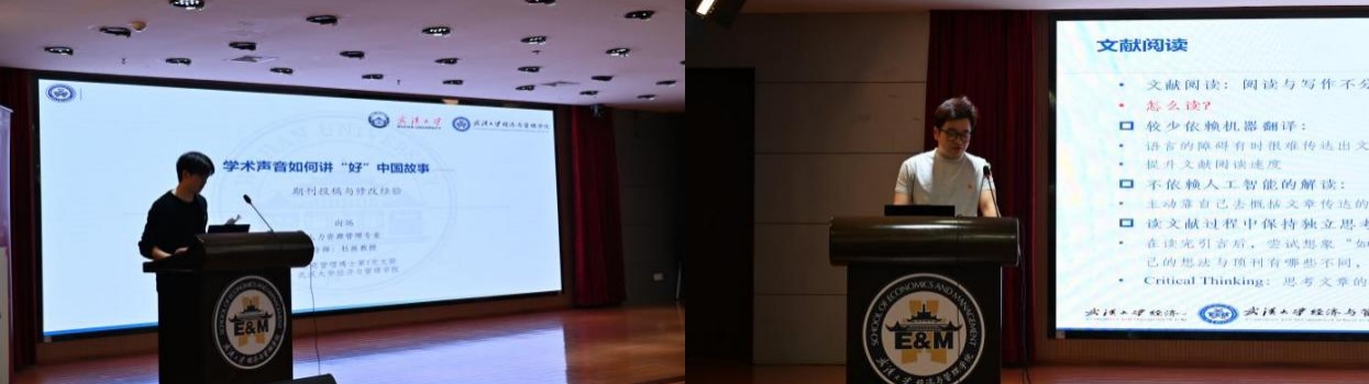 學(xué)術(shù)經(jīng)驗(yàn)分享環(huán)節(jié),2023級人力資源管理專業(yè)博士生向遠(yuǎn)、2025級企業(yè)管理專業(yè)博士生張碩分別以“學(xué)術(shù)聲音如何講‘出’中國故事——論文寫作與發(fā)表路徑”、“學(xué)術(shù)聲音如何講‘好’中國故事——科研方法工具箱”為題分享。向遠(yuǎn)結(jié)合投稿經(jīng)歷,強(qiáng)調(diào)研究內(nèi)容“斷舍離”與細(xì)致回應(yīng)審稿意見的重要性;張碩則從文獻(xiàn)檢索、管理、數(shù)據(jù)分析及軟件工具應(yīng)用等方面,提供實(shí)用科研技巧。