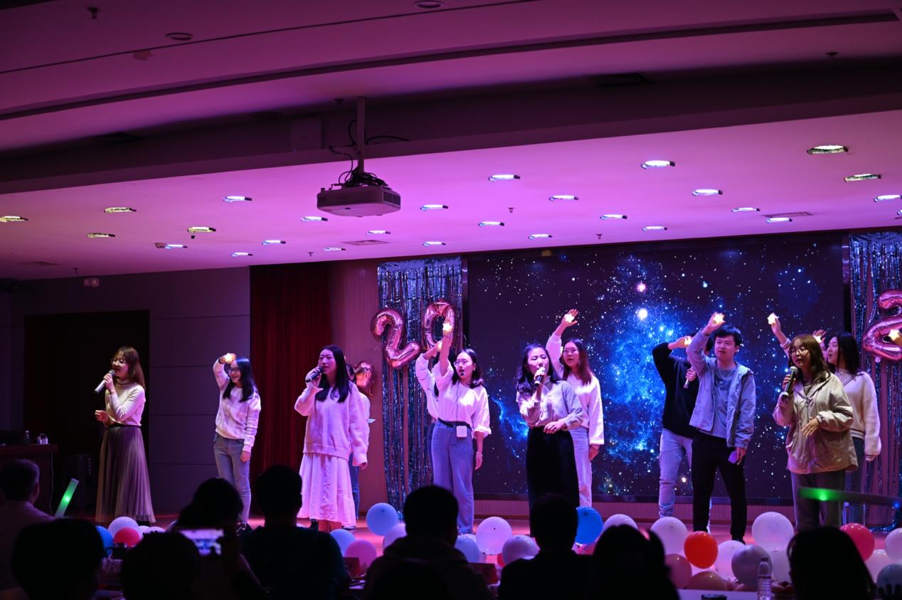 一輪表演過后,迎來了互動(dòng)抽獎(jiǎng)環(huán)節(jié),現(xiàn)場(chǎng)氣氛迭升,歡呼不斷。此后,科碩八班帶來情景式演唱《檸檬樹下你和我》,唱、跳、rap齊上陣,博得了觀眾陣陣掌聲。在熱鬧的氣氛之后,魏宇騁與王樹帶來二重唱《都是夜歸人》,歌聲渾厚、情緒飽滿、令人回味無窮。科碩五班帶來情景劇《裂縫中的陽光》,在致敬無私奉獻(xiàn)的醫(yī)護(hù)人員的同時(shí),也讓我們看到疫情中每一個(gè)鮮活生命的溫暖故事。科碩六班的《云煙成雨》也讓現(xiàn)場(chǎng)觀眾陶醉其中。